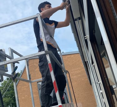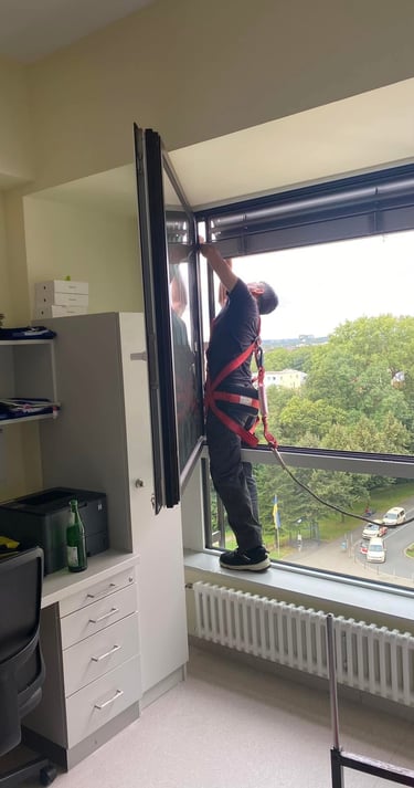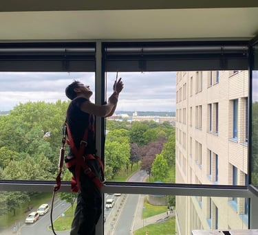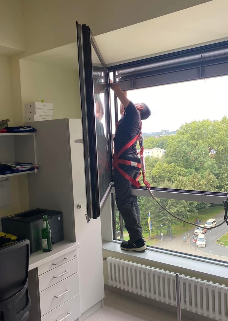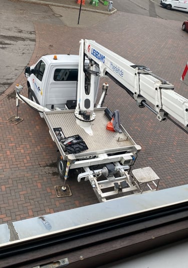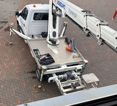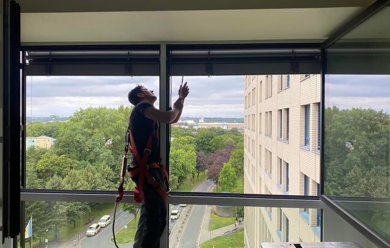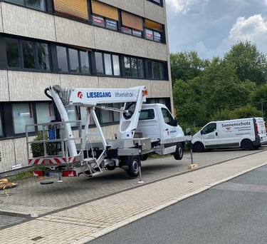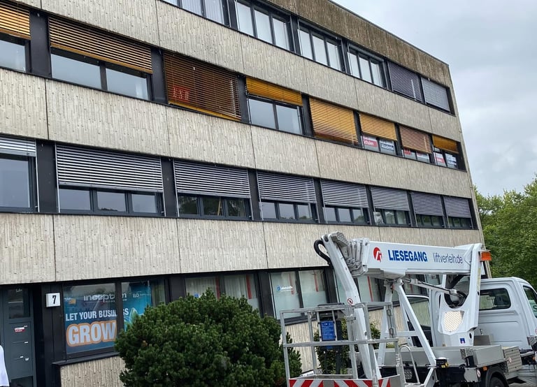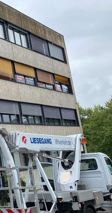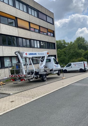 Demontage und Montage von Außenjalousien mit Hilfe eines Hubsteigers